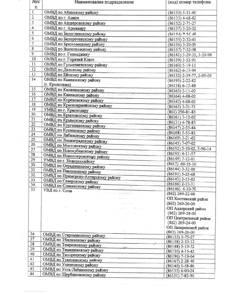 Публикуем номера телефонов дежурных частей территориальных органов Министерства внутренних дел Российской Федерации по Краснодарскому краю с целью обеспечения возможности оперативного информирования о фактах, связанных с незаконным оборотом наркотиков.
