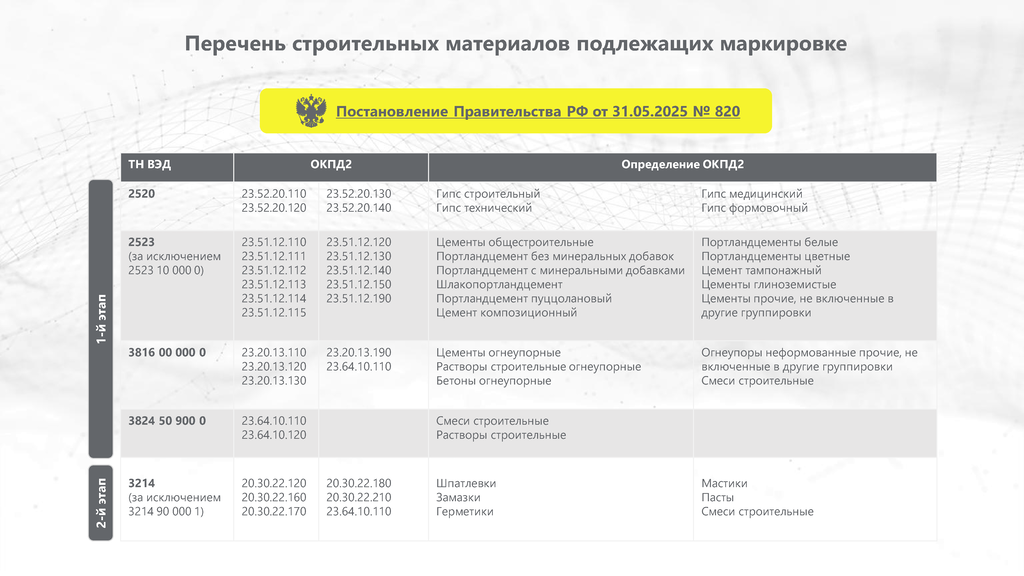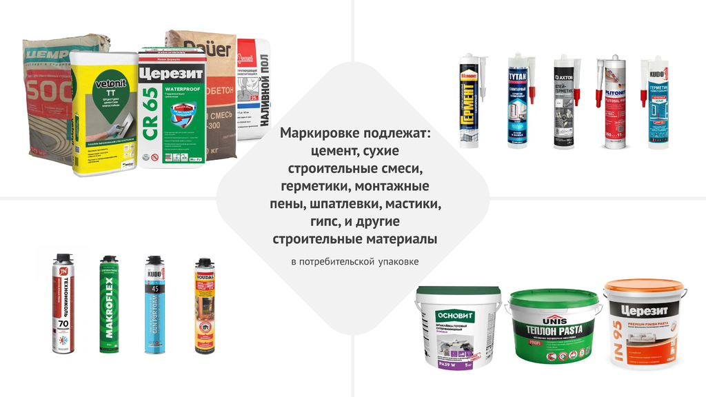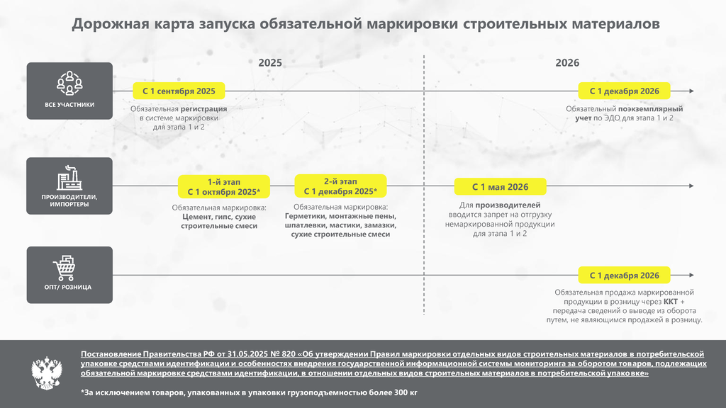 Информируем Вас, что в соответствии с Постановлением Правительства Российской Федерации от 31 мая 2025 г. № 820 утверждены Правила маркировки отдельных видов строительных материалов в потребительской упаковке средствами идентификации, согласно которым: