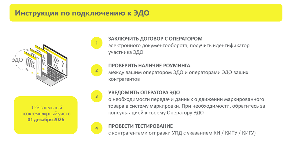 - с 1 декабря 2026 наступает обязательная подача сведений о выбытии маркированного товара (как через ККТ, так и иными способами), а также обязательная передача кодов маркировки через ЭДО посредством УПД между всеми участниками оборота.